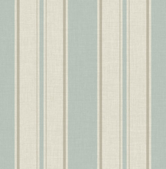 Hladká béžová vliesová tapeta s tyrkysovými pruhy. Efekt tkaniny.