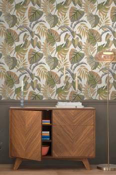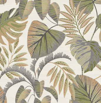 Hladká šedo-bílá vliesová tapeta, design tropických listů v odstínech zelené a oranžové.