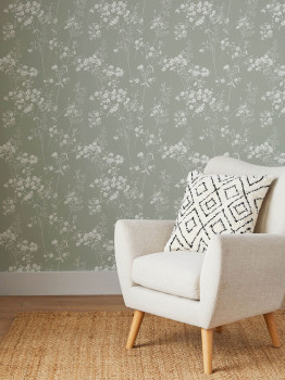 Hladká, šalvějově zelená, vliesová tapeta s motivy květinových větviček.