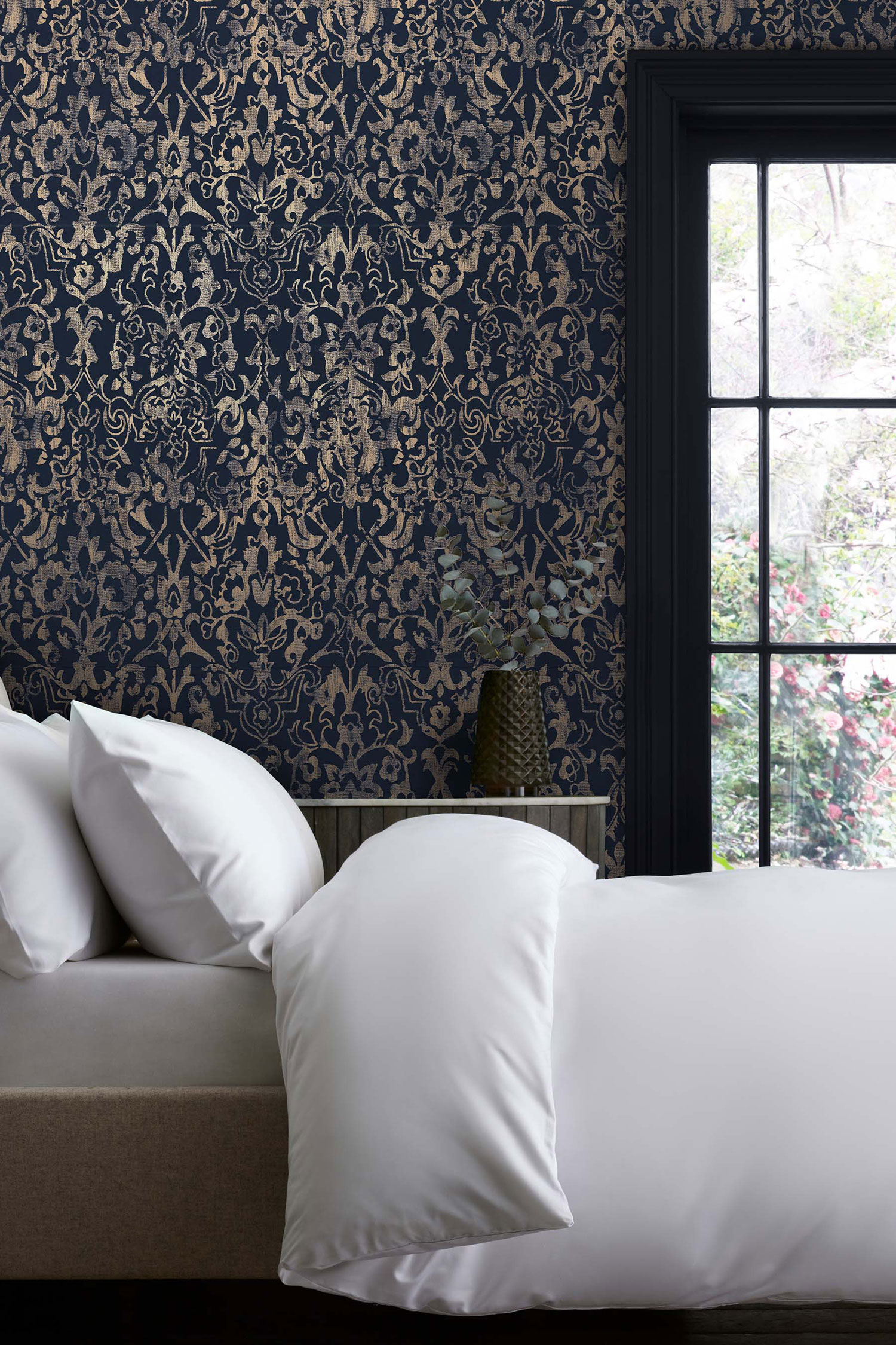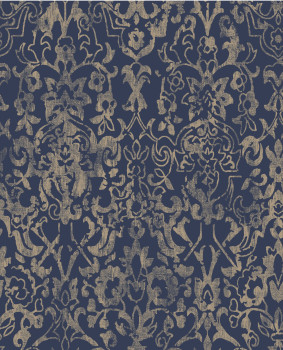 Námořnická modrá vliesová tapeta na zeď, potisk vintage damaškový vzor v odstínu růžového zlata.