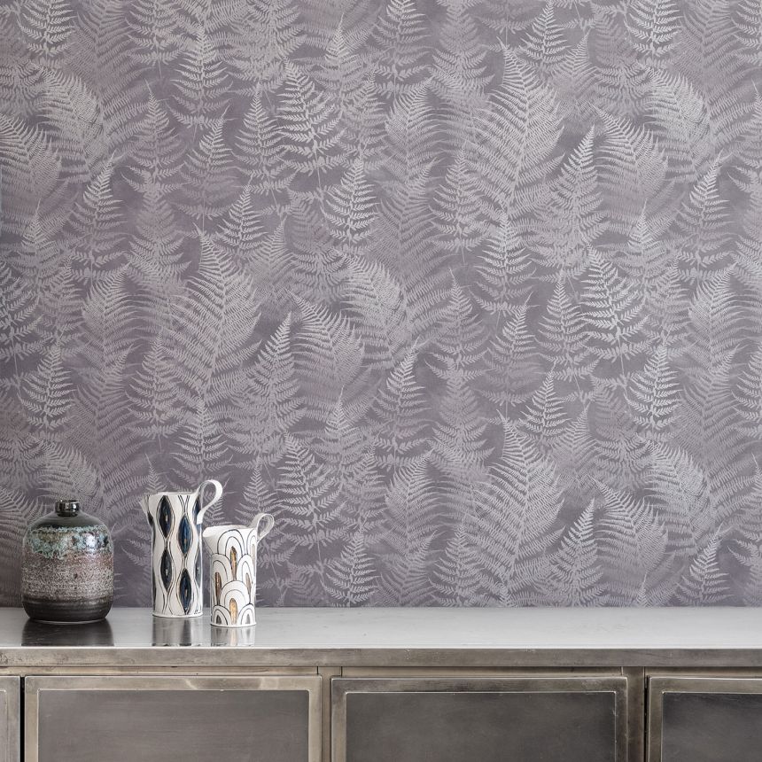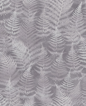 Pololesklá šedo-stříbrná vliesová tapeta na zeď, motivy listů kapradin.