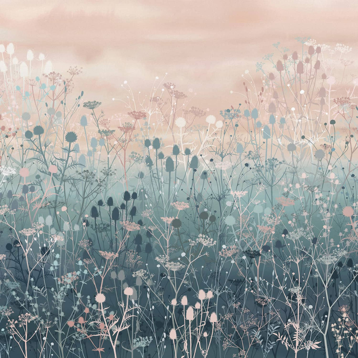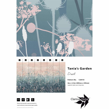 • Úchvatná fototapeta Tania's Garden evokuje louku s divokými květinami za soumraku v kouřové ruměnci a mlhavé šedé ombre paletě. Design byl inspirován jedním z Clarissiných oblíbených míst – kouzelnou zahradou patřící její přítelkyni a renomované zahradní designérce Tanii Compton. Bohatá změť lučních trav, hlaviček koprových semen a verbeny zachycuje podstatu divoké a přirozené krásy.