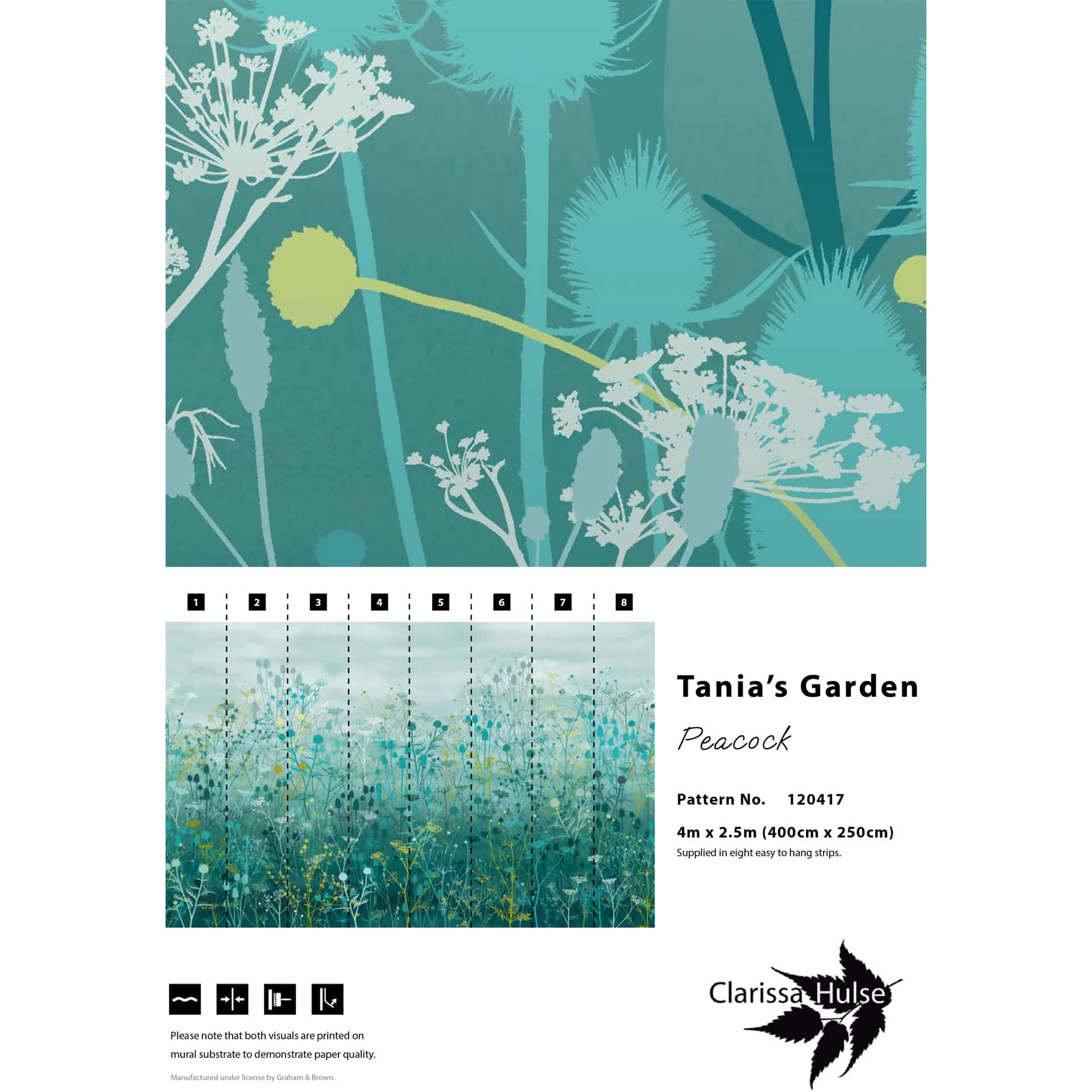 Úchvatná fototapeta Taniina zahrada evokuje na první pohled louku s divokými květinami ve světle modrozelené, tyrkysové a chartreuse paletě. Design byl inspirován jedním z Clarissiných oblíbených míst – kouzelnou zahradou patřící její přítelkyni a renomované zahradní designérce Tanii Compton. Bohatá změť lučních trav, hlaviček koprových semen a verbeny zachycuje podstatu divoké a přirozené krásy.