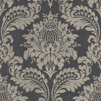 Černá vliesová tapeta na zeď, šedo-stříbrný damaškový zámecký vzor.