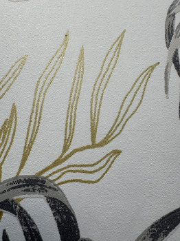 Krémová vliesová tapeta s vinylovým povrchem, motivy tropických listů v odstínech šedé a okrové, místy se zlatými odlesky.