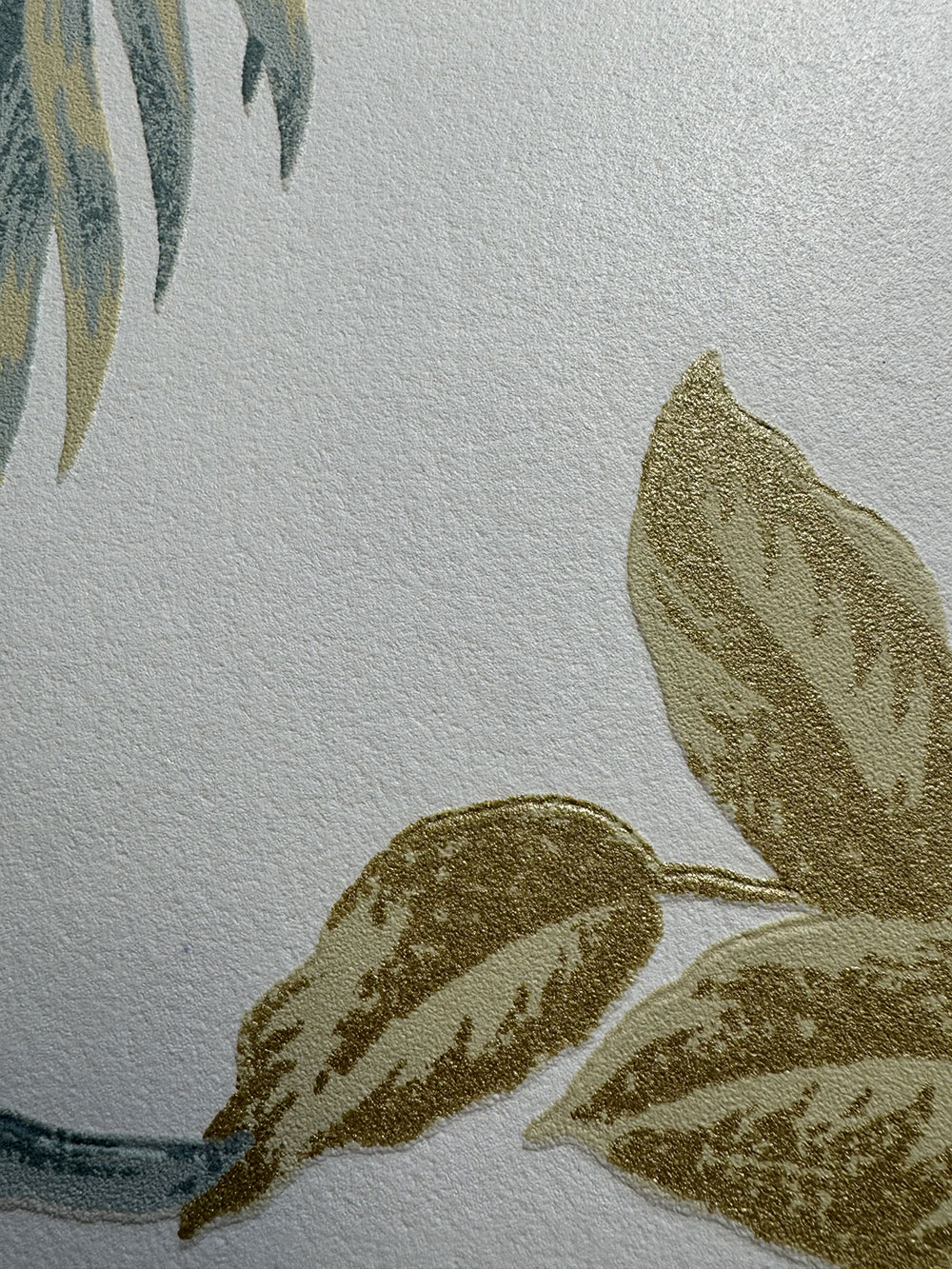 Krémová vliesová tapeta s vinylovým povrchem, motivy tropických listů v odstínech zelené a okrové, místy se zlatými odlesky.