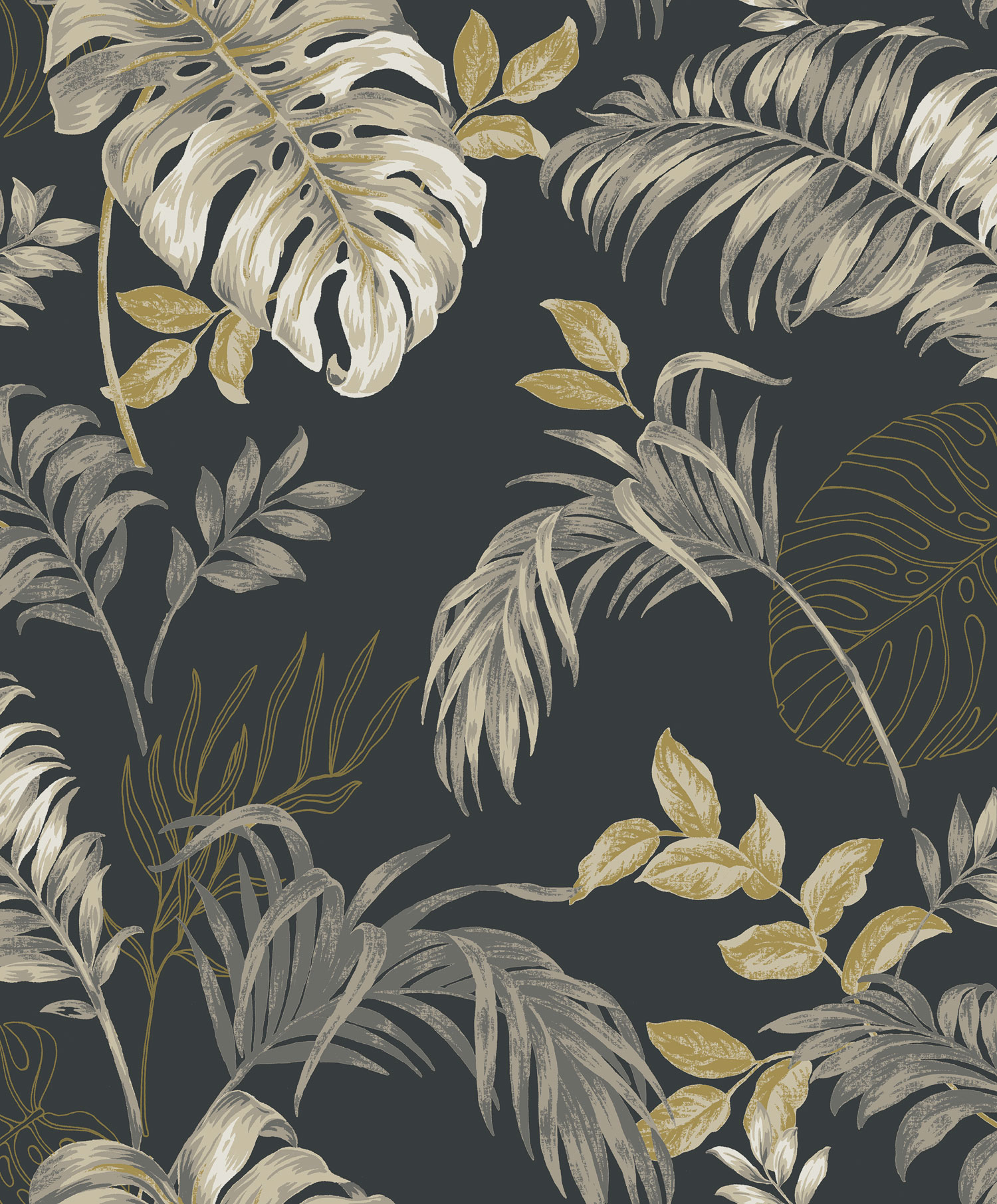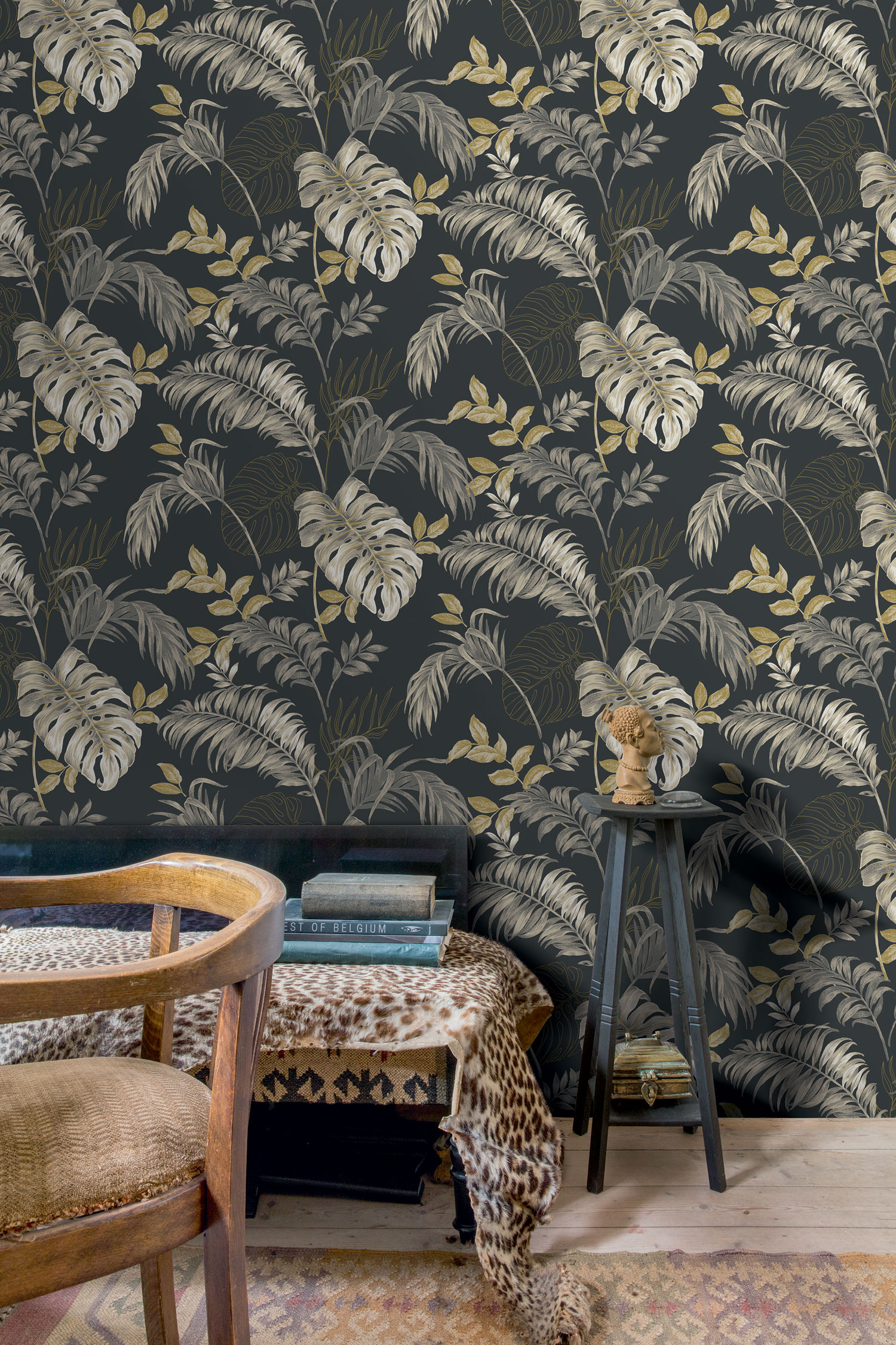 Černá vliesová tapeta s vinylovým povrchem, motivy tropických listů v odstínech šedé, okrové a béžové, místy s metalickými odlesky.