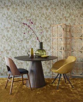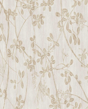 Jemně plastická béžová vliesová tapeta s vinylovým povrchem, motivy větviček a listů.