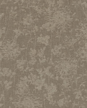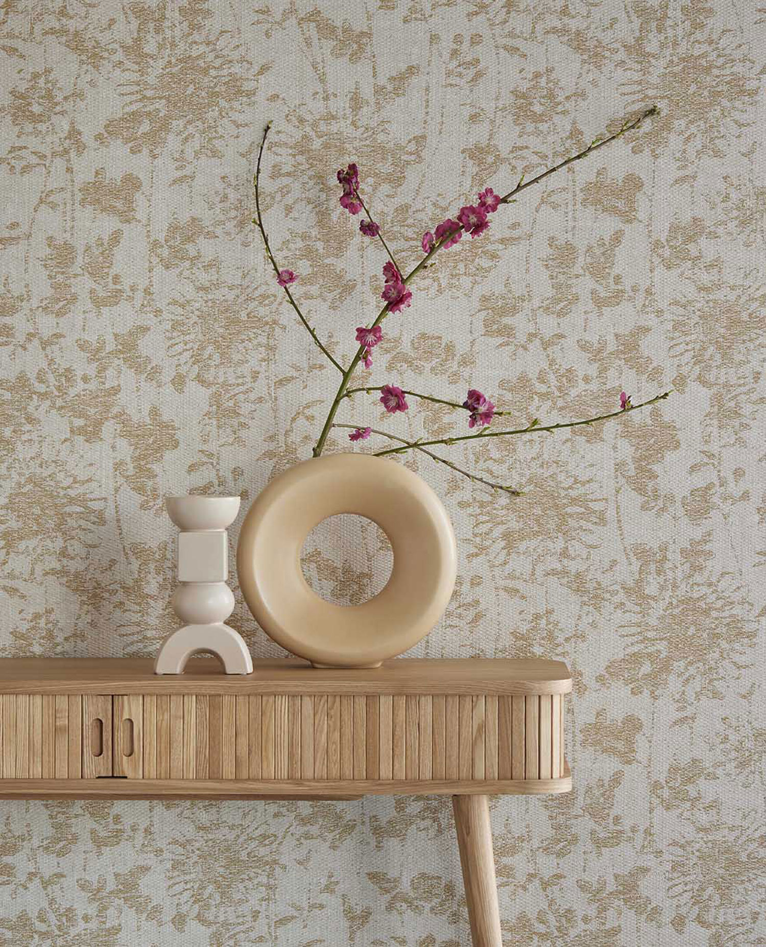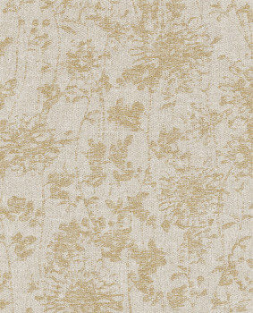 Krémová vliesová tapeta s vinylovým povrchem, béžové motivy květin, imitace hrubé rustikální textilie.
