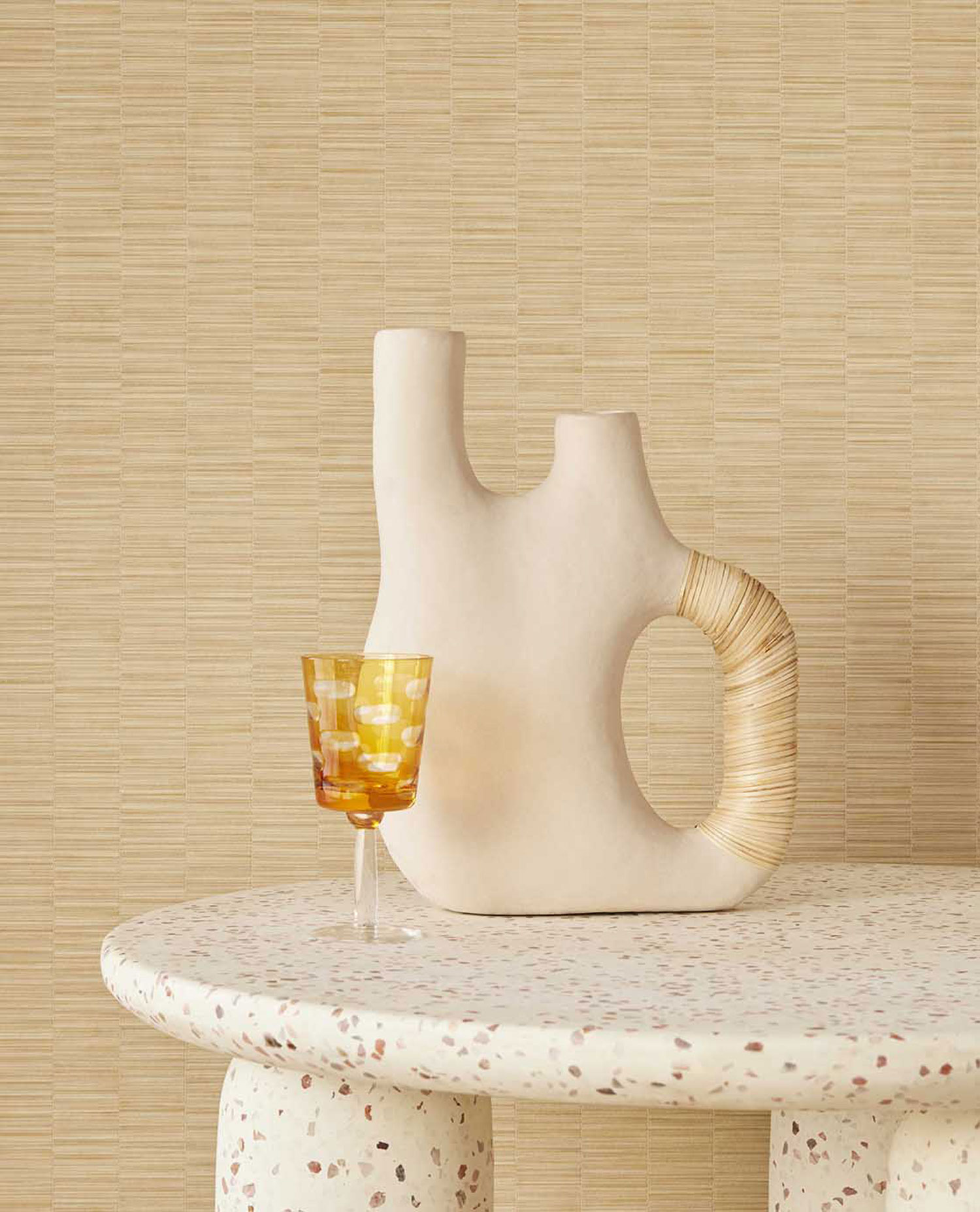 Krémová vliesová tapeta s vinylovým povrchem, imitace prošívaného jemného bambusu.
