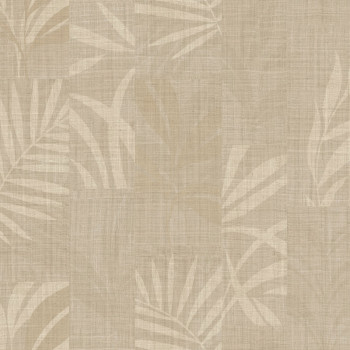 Luxusní vliesová tapeta s vinylovým povrchem, plastické motivy listů v odstínech pololesklé šedo-béžové, hrubší látková textura. Foto interiéru je pouze ilustrační - odlišné barvy.