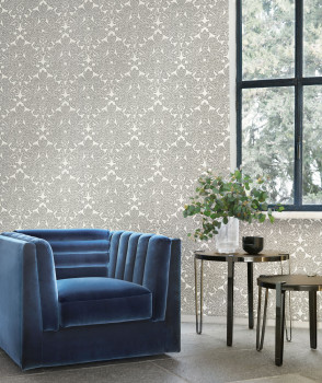 Luxusní vliesová tapeta s vinylovým povrchem, plastický zámecký vzor v odstínech pololesklé šedé a krémové, krémový podklad.