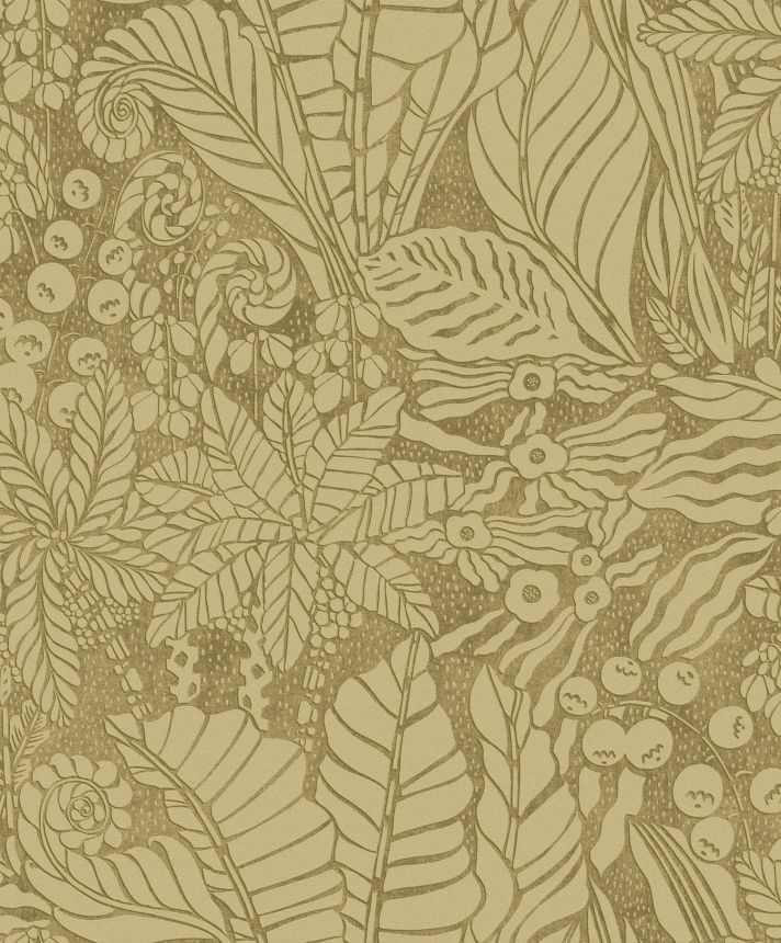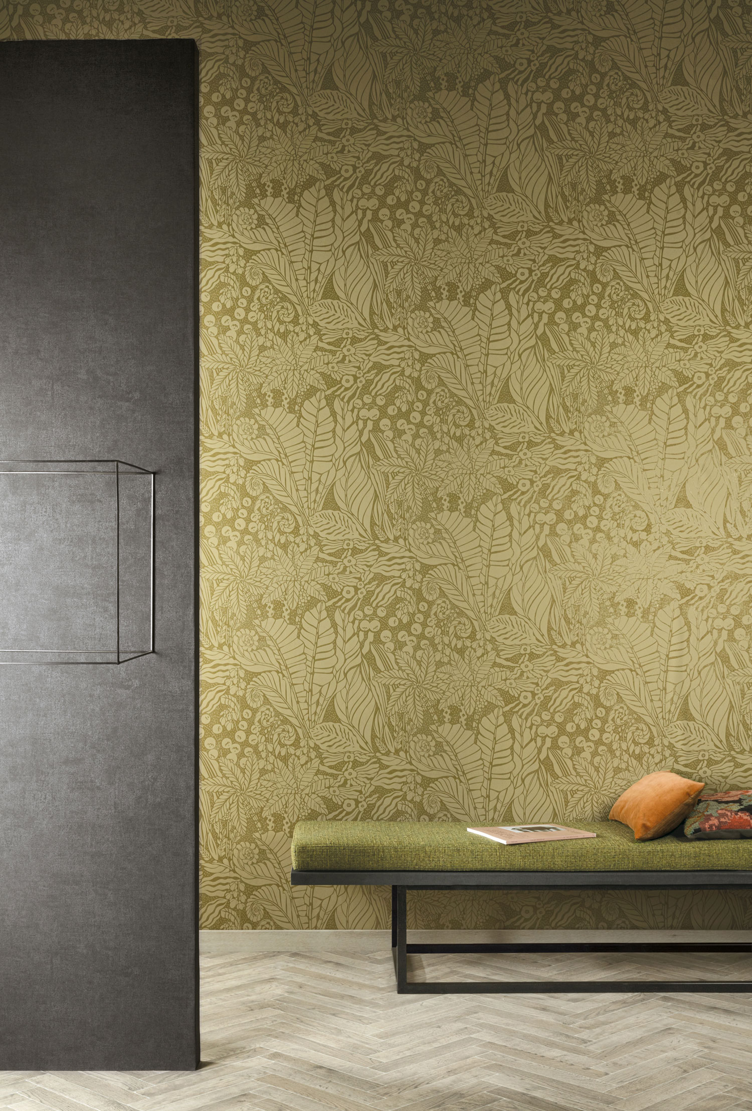 Olivově zelená plastická vliesová tapeta na zeď, motivy listů - efekt pololesku a matu.