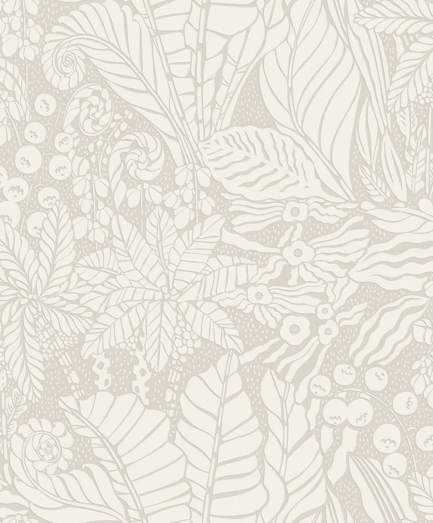 Krémová plastická vliesová tapeta na zeď, motivy listů - efekt stříbřitého pololesku a matu. Foto interiéru je pouze ilustrační - odlišné barvy.