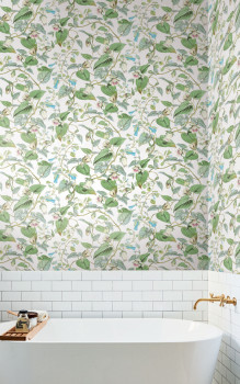 Vliesová květinová tapeta na zeď, popínavá Povíjnice v odstínech zelené a modré, bílý podklad.