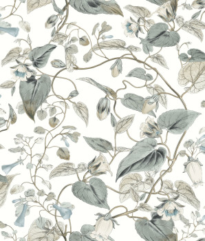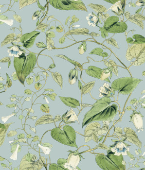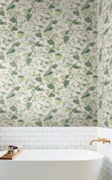 Vliesová květinová tapeta na zeď, popínavá Povíjnice v odstínech zelené, růžové a modré, světle béžový podklad.