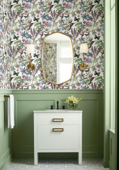 Bílá vliesová tapeta na zeď, květiny a motýli v odstínech zelené, vínové, modré a béžové.