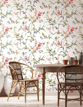 Vliesová květinová tapeta na zeď, rozkvetlé větvičky v odstínech zelené, červené a lososové, bílý podklad.