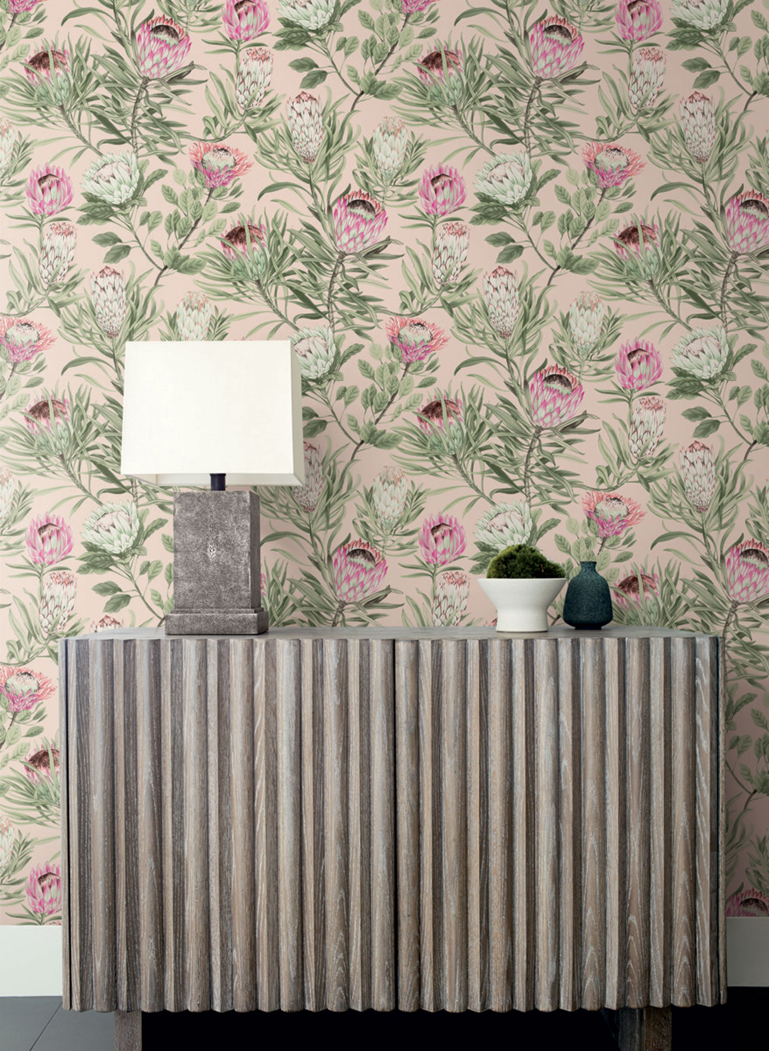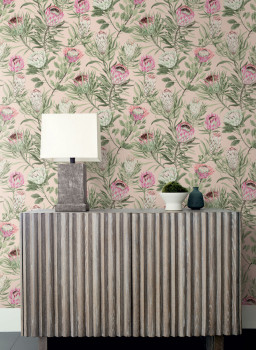 Béžová vliesová tapeta na zeď, motiv exotické květiny Protea v odstínech zelené, růžové a červené.
