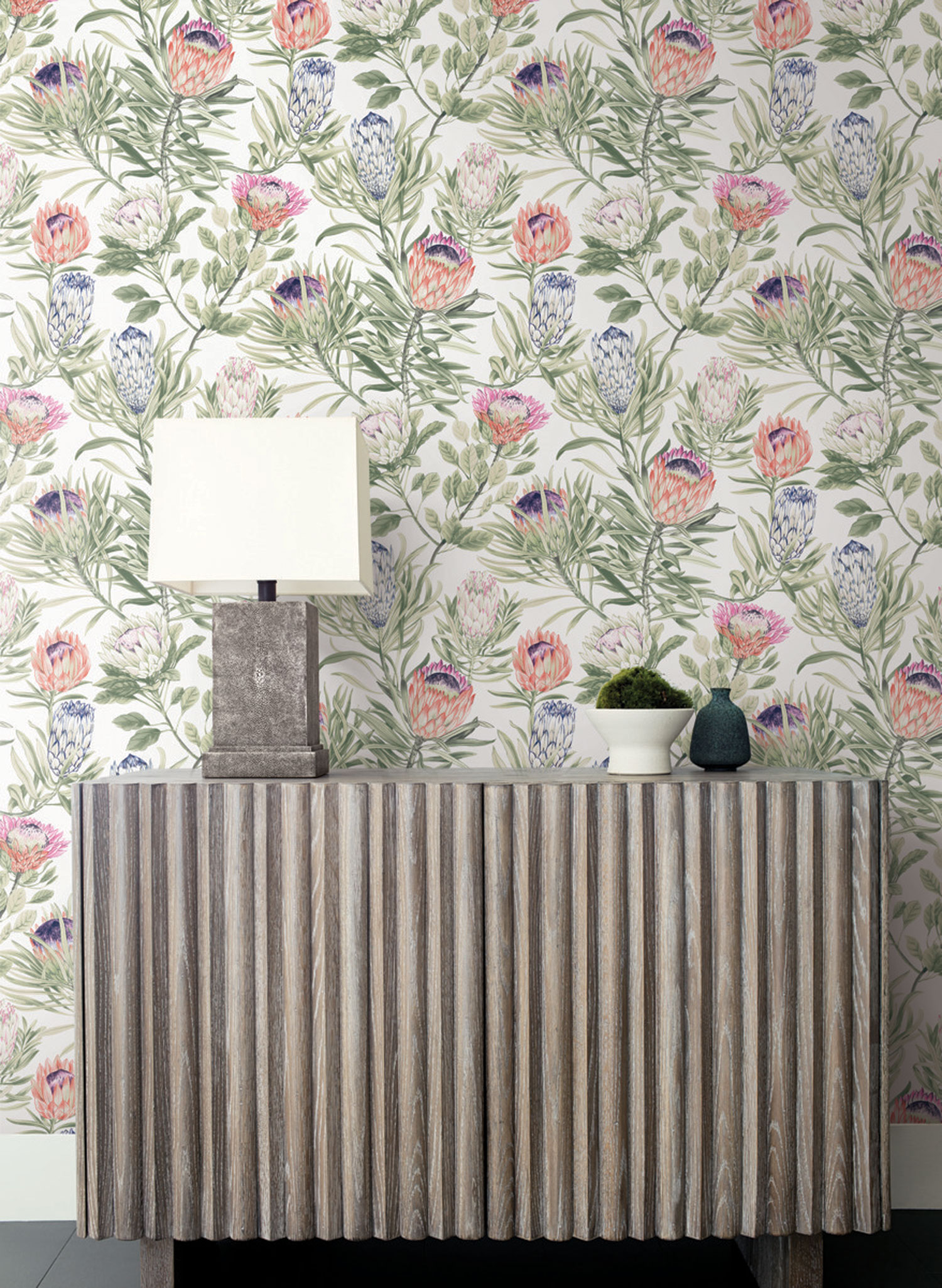 Bílá vliesová tapeta na zeď, motiv exotické květiny Protea v odstínech zelené, modré, červené a béžové.