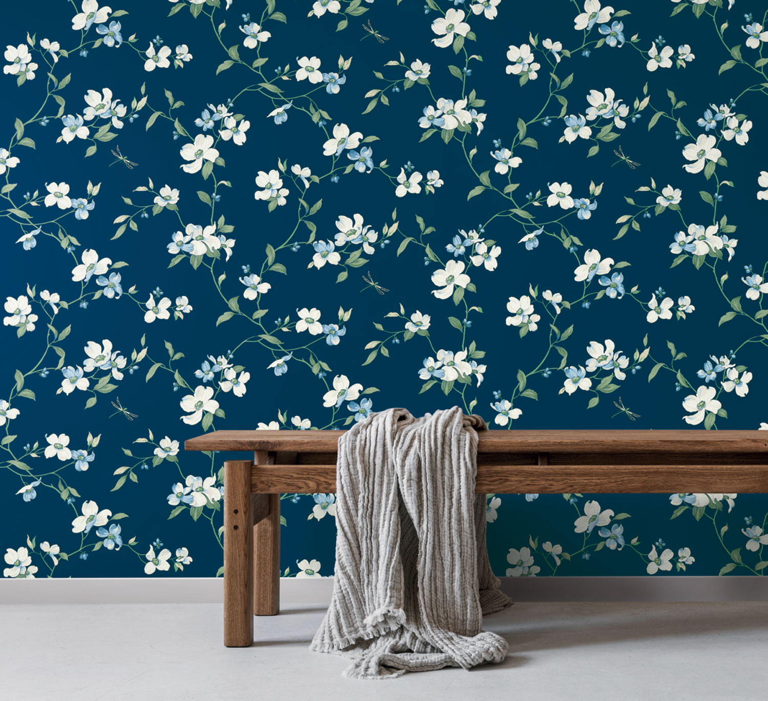 Tmavě modrá vliesová tapeta na zeď, jemně plastické květy dřínu v odstínech bílé, modré a zelené.