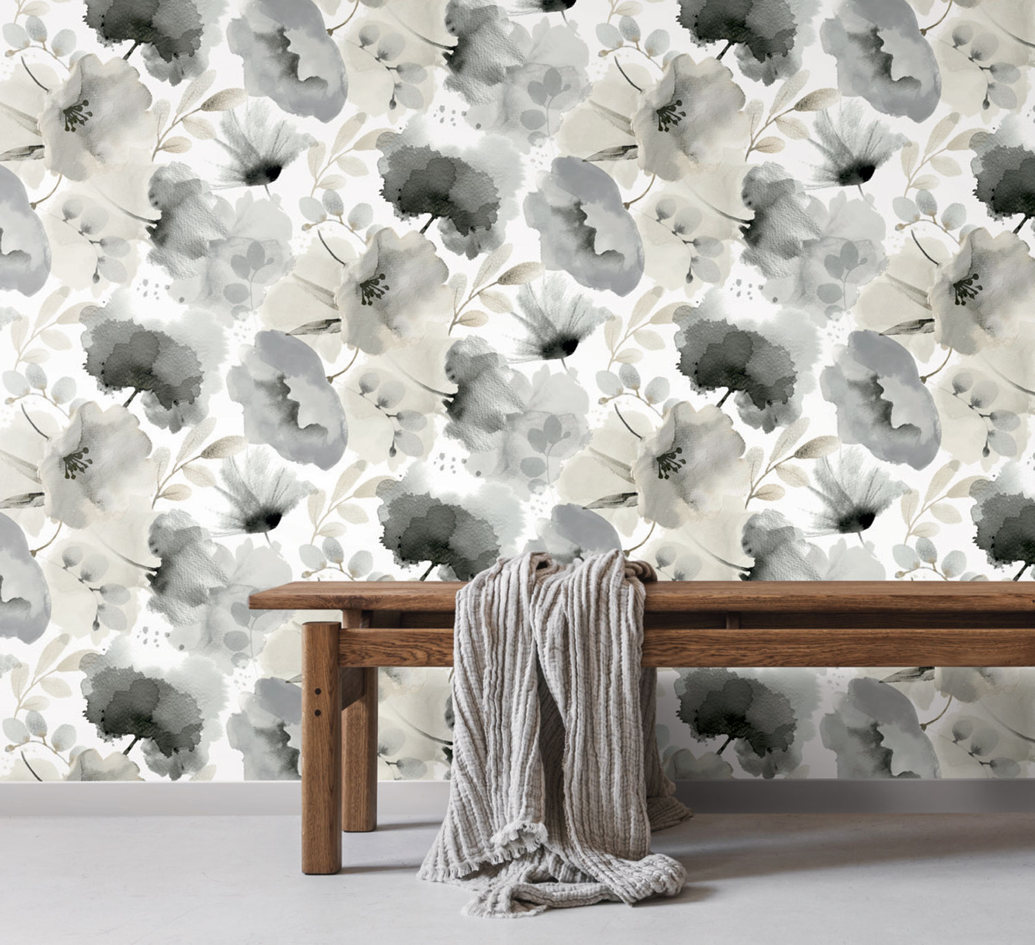 Šedo-béžová květinová vliesová tapeta na zeď, efekt malby akvarelem.