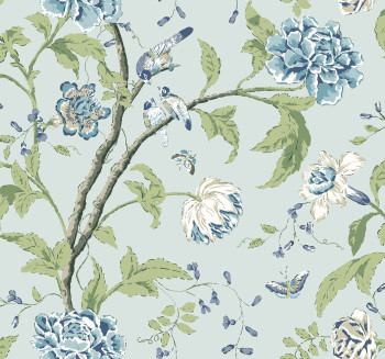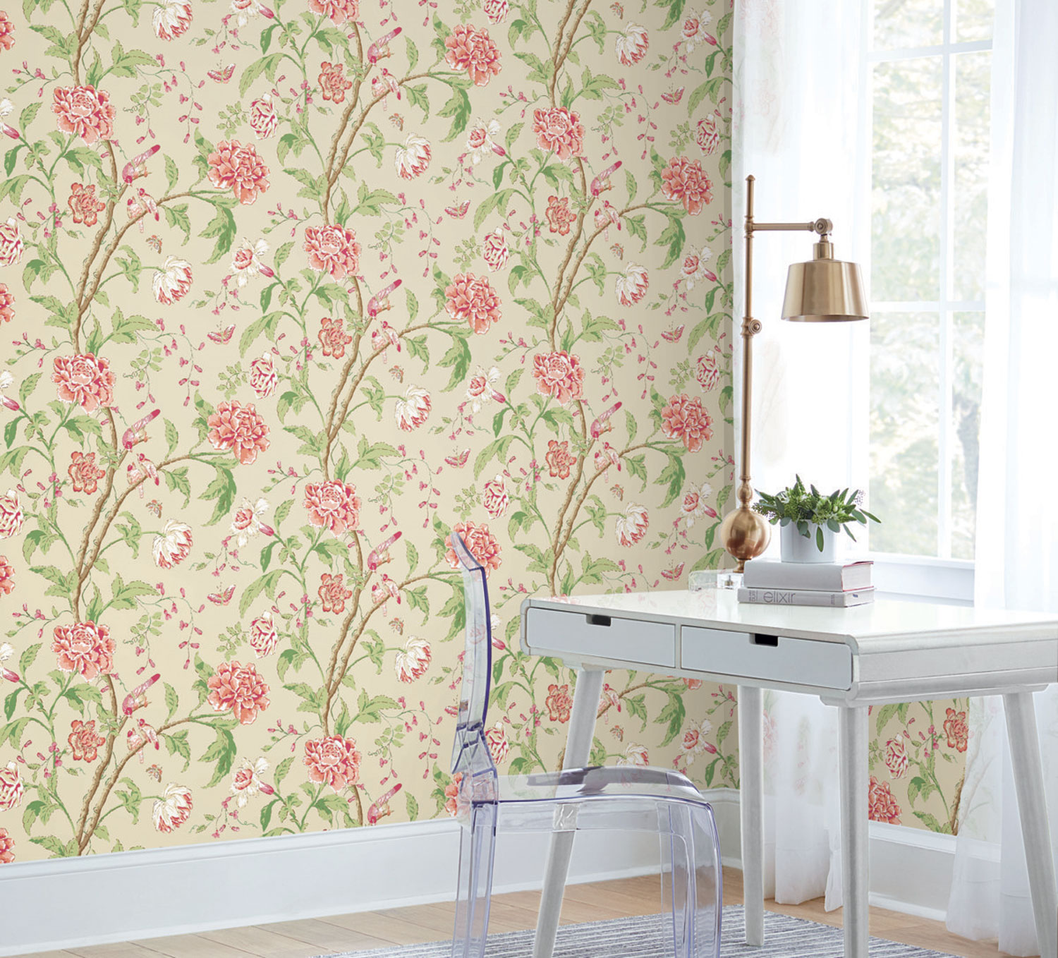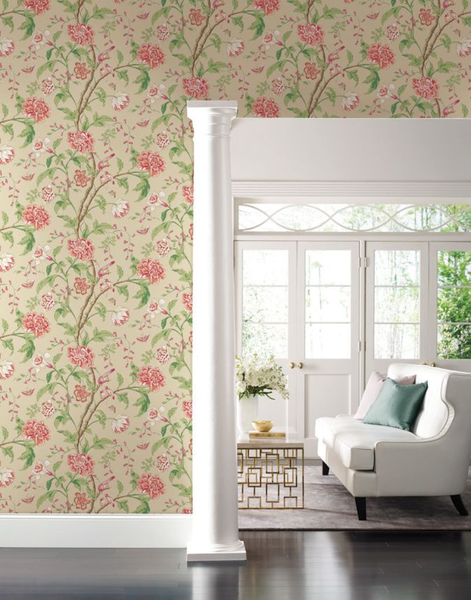 Světle béžová vliesová tapeta na zeď, rozkvetlé větvičky v odstínech korálové, zelené a krémové, motýli a ptáčci.