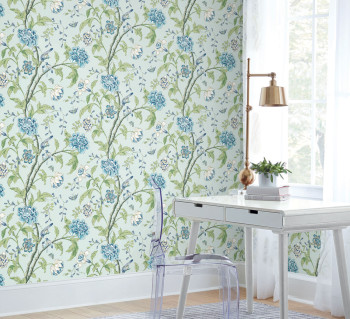Světle modrá vliesová tapeta na zeď, motýli, ptáčci a rozkvetlé větvičky v odstínech modré, zelené a béžové.