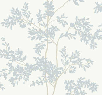 Bílá vliesová tapeta na zeď, větvičky v odstínech modré a limetkové.