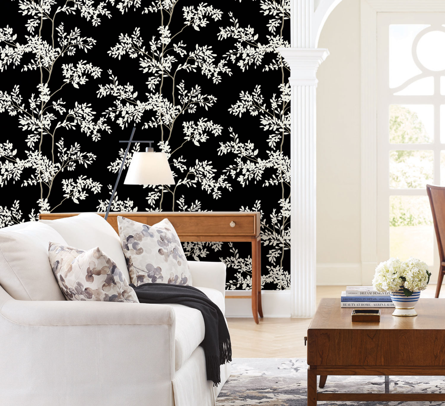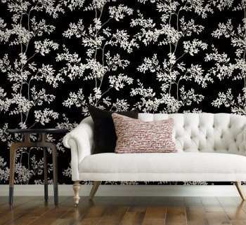 Černá vliesová tapeta na zeď, větvičky v odstínech bílé a stříbrné.