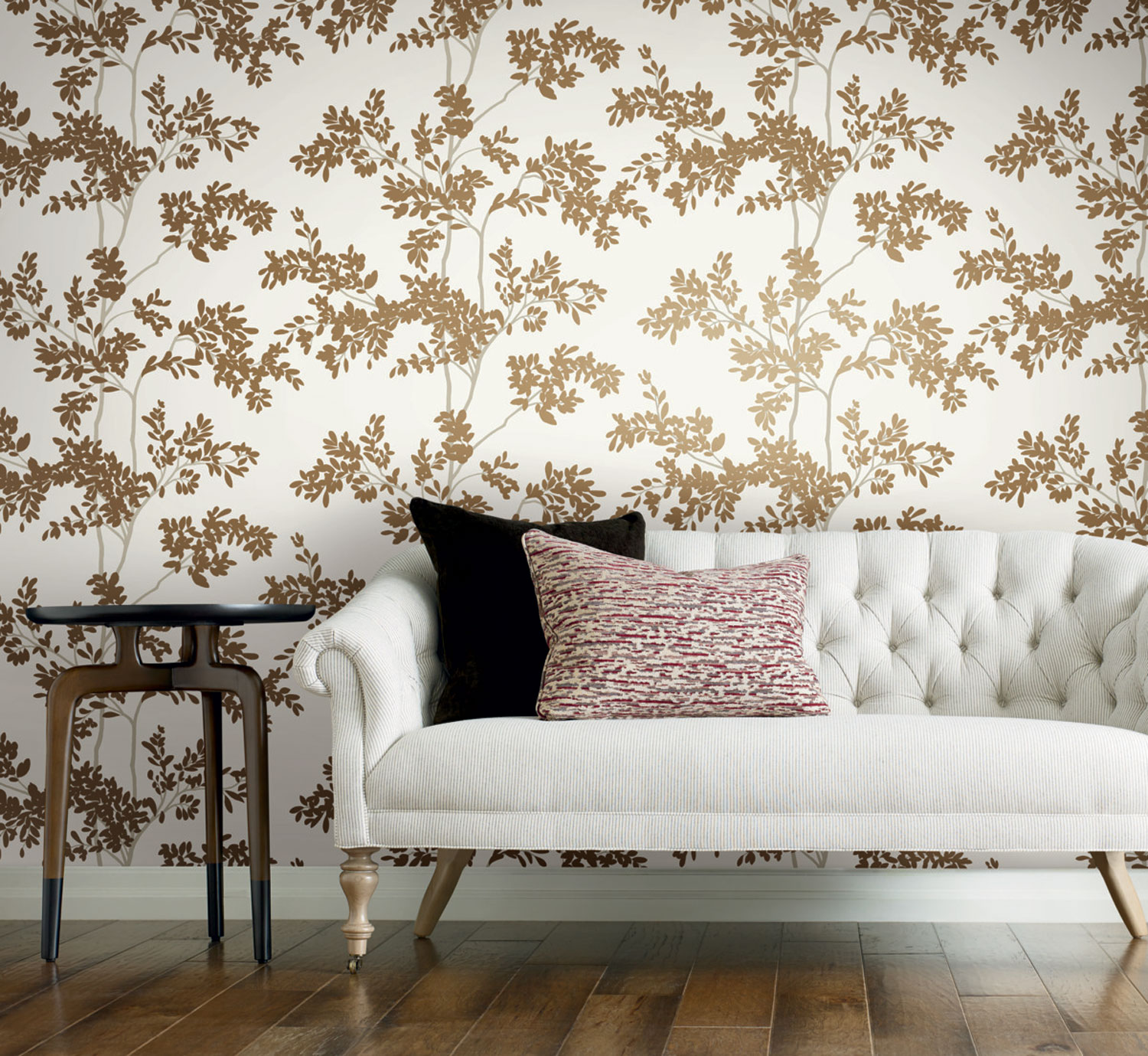 Bílá vliesová tapeta na zeď, zlaté a béžové větvičky.