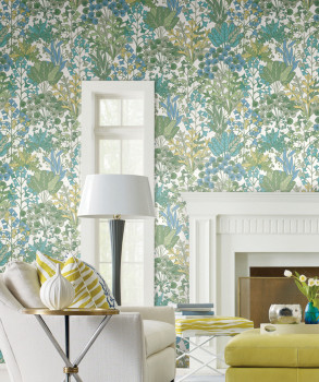 Bílá vliesová tapeta na zeď, rostliny a listy v odstínech zelené, modré, žluté a béžové.
