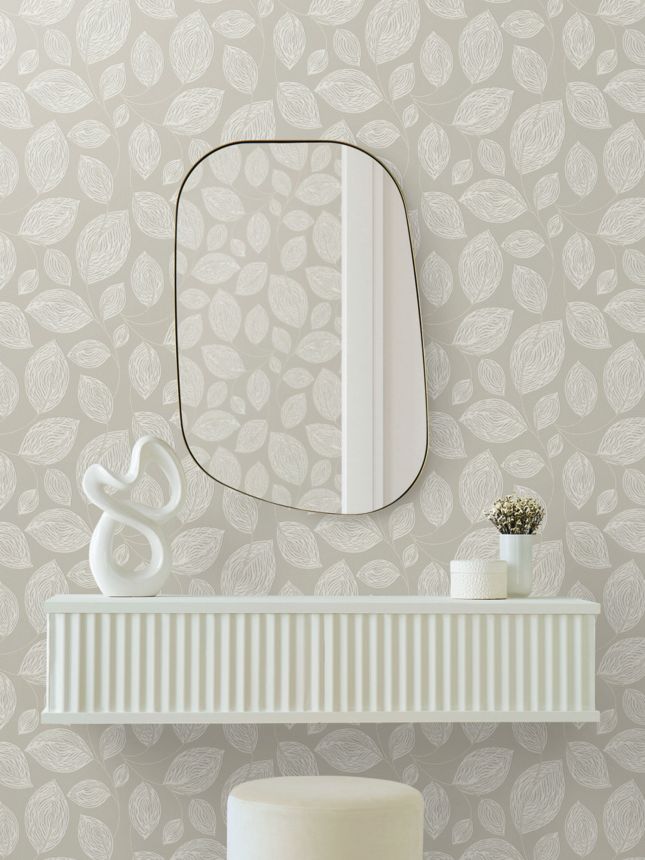 Metalická hnědá vliesová tapeta na zeď, výrazně plastické bílé listy.