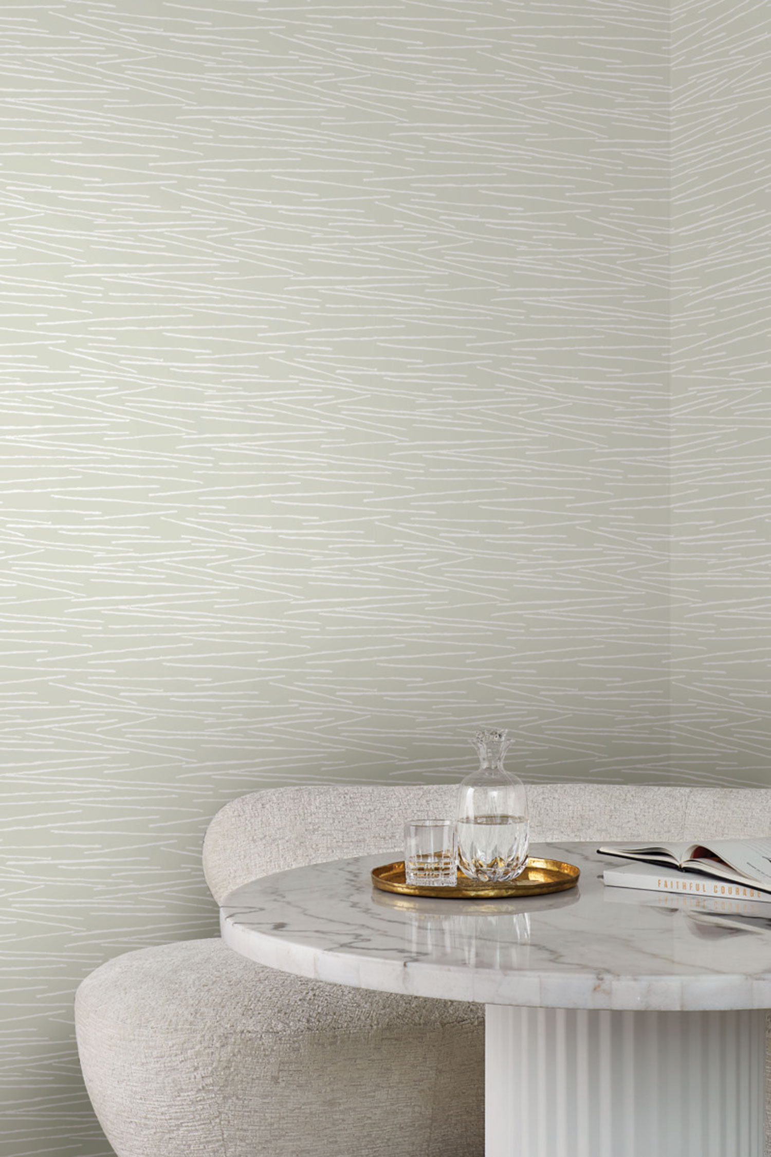 Šedo-zelená vliesová tapeta na zeď, nepravidelné bílé plastické linie.