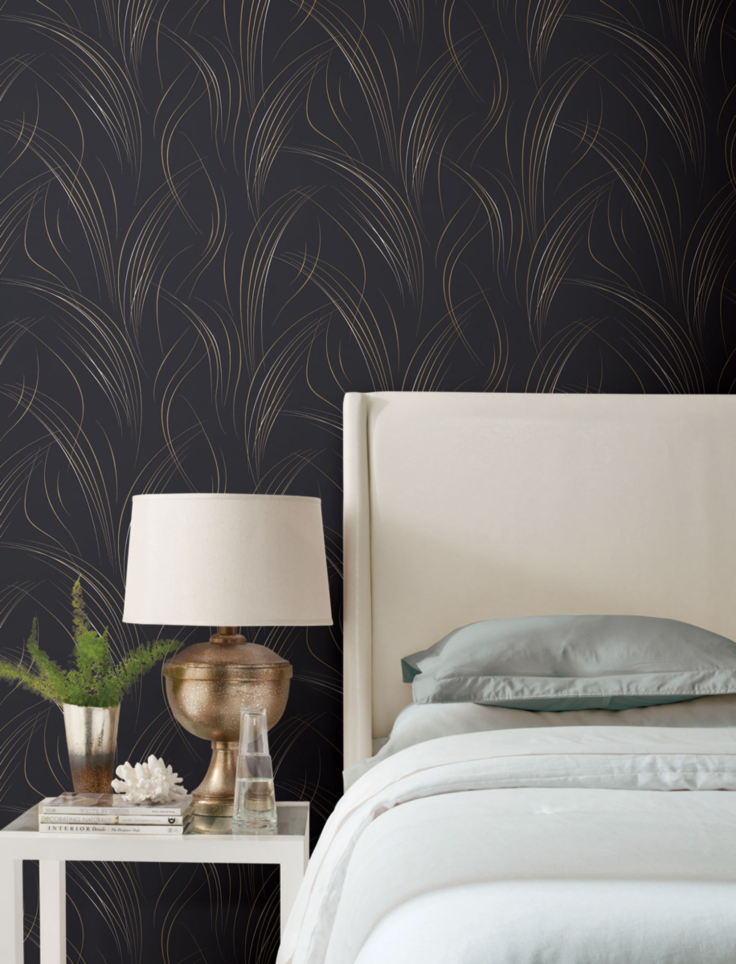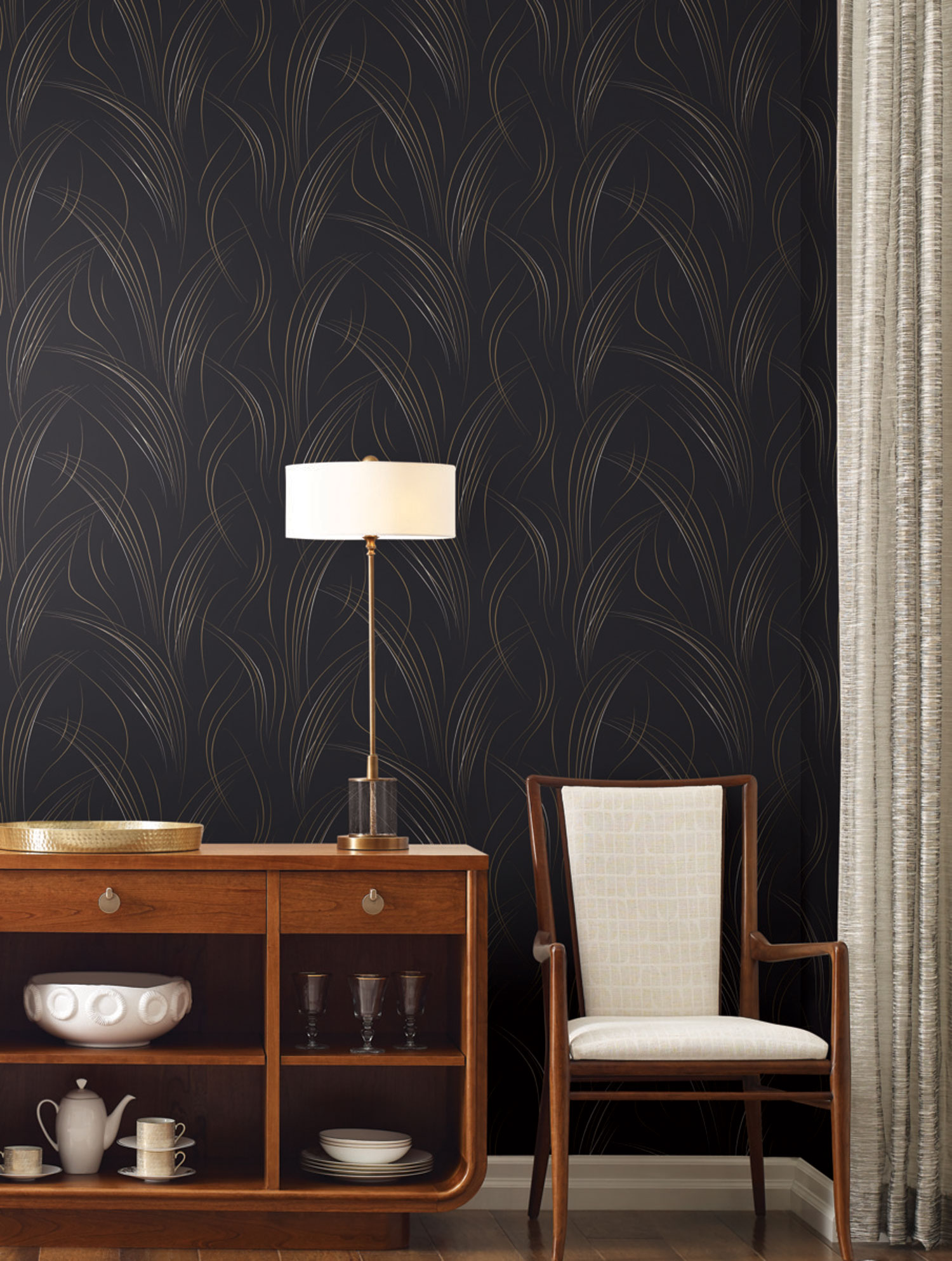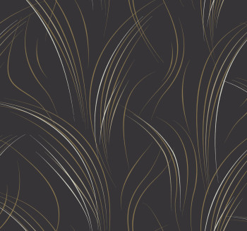 Černá vliesová tapeta na zeď, bílé, hnědé a béžové linie.