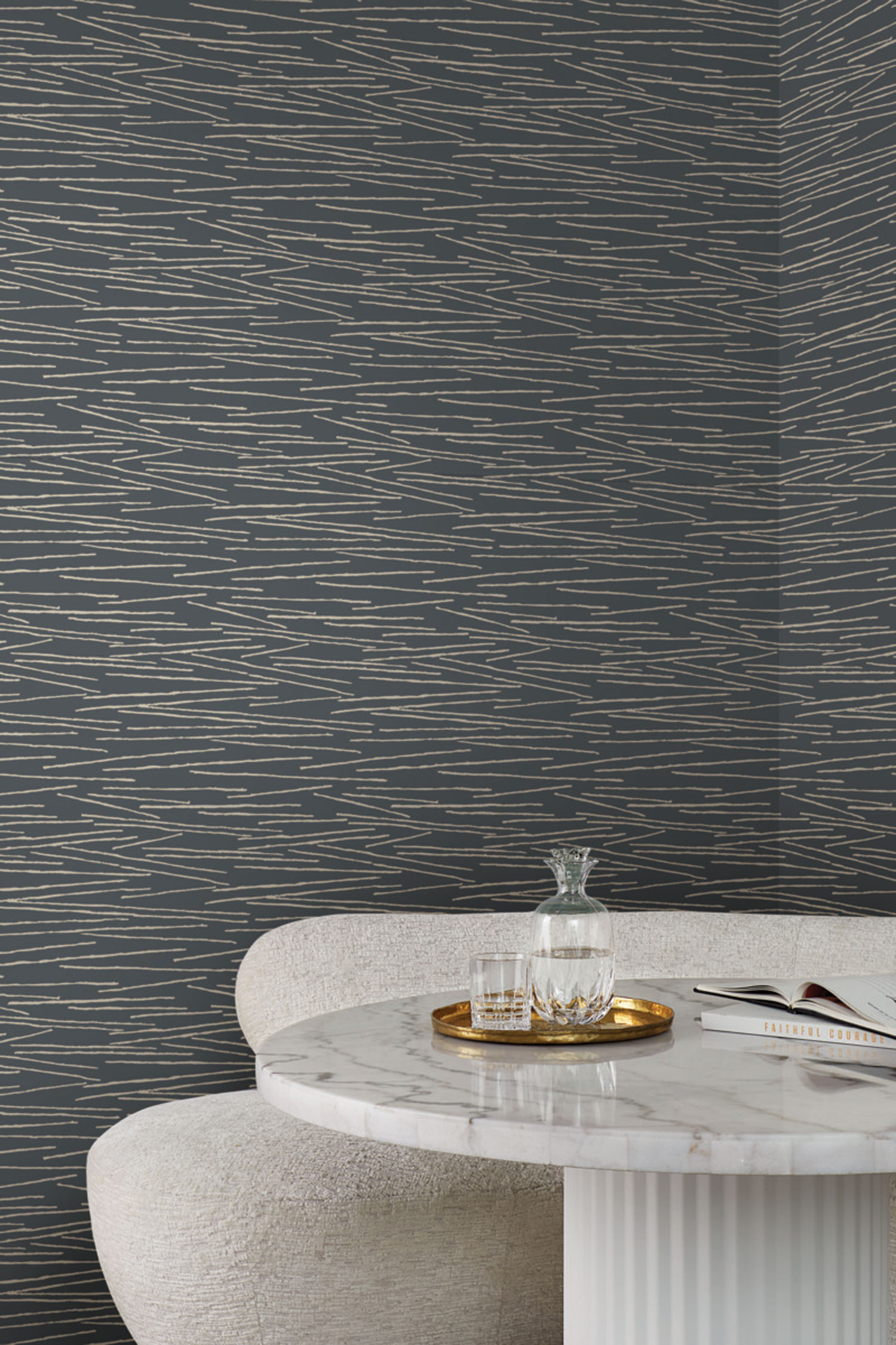 Černá vliesová tapeta na zeď, nepravidelné béžové plastické linie.