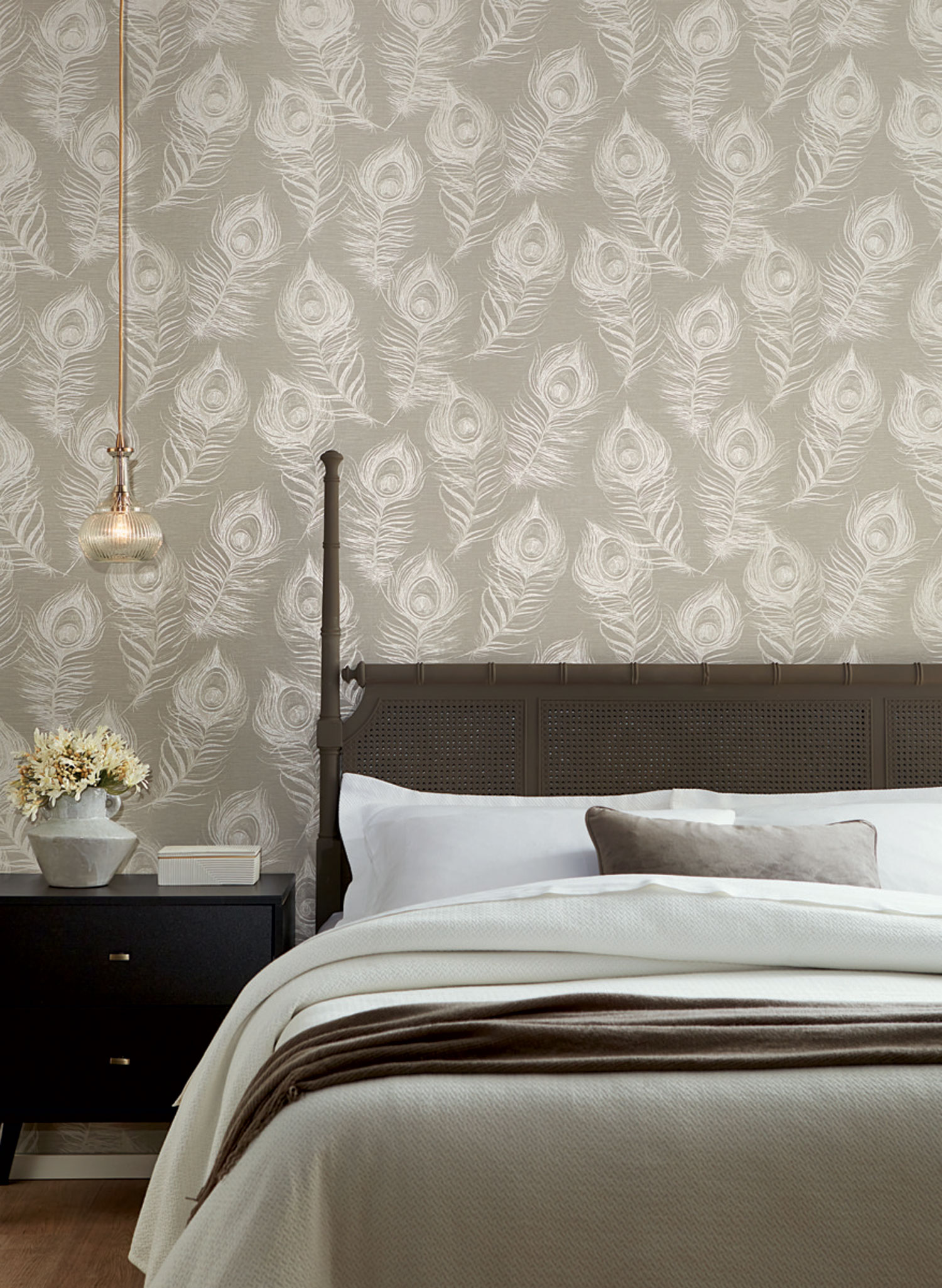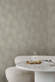 Šedá vliesová tapeta na zeď, motivy pavích per v odstínech šedé a stříbrné.