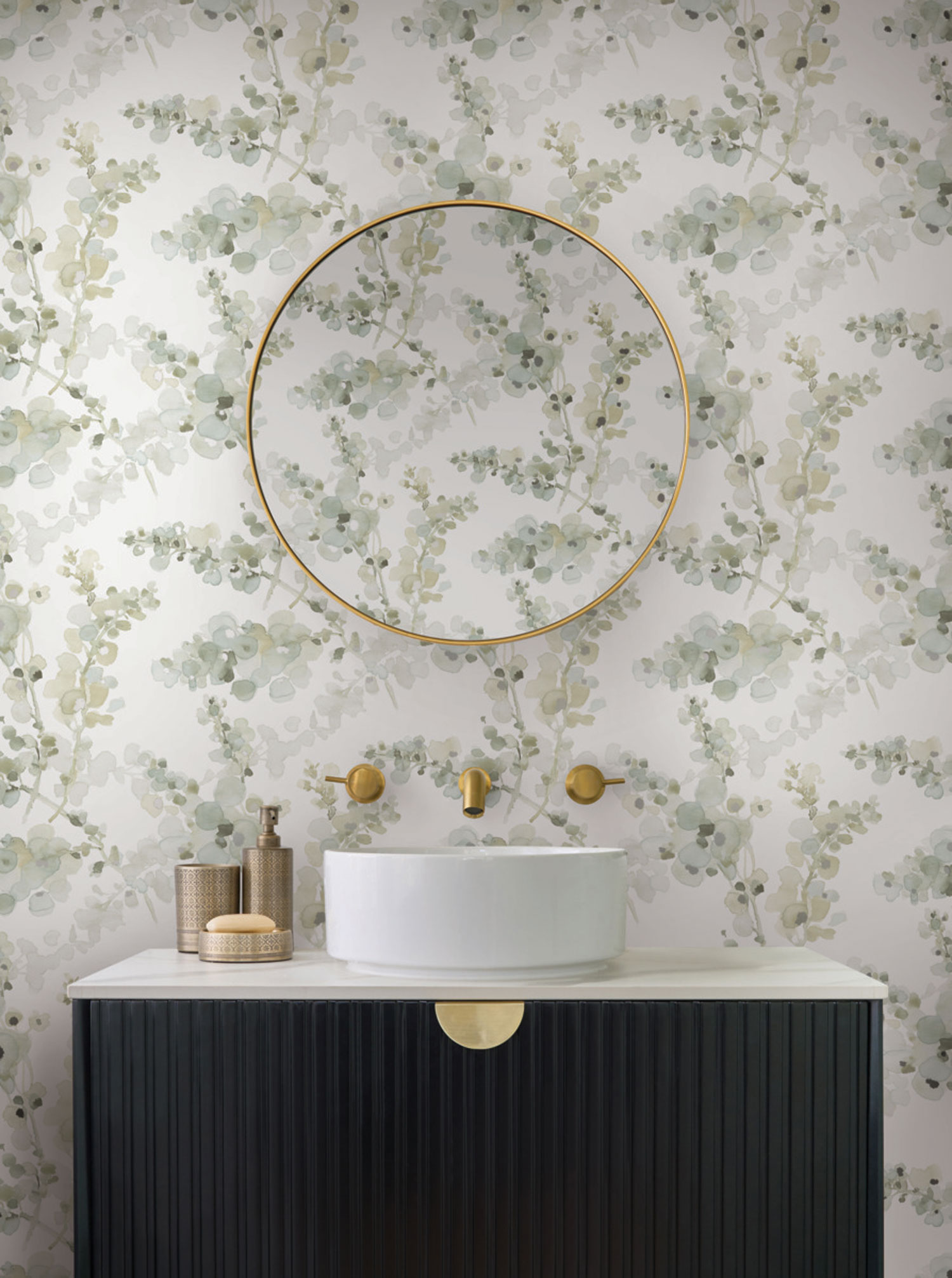 Bílá vliesová tapeta na zeď, květinový vzor evokuje malbu akvarelem, odstíny šedé, zelené a béžové, metalické stříbrné detaily.