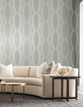Šedo-modrá vliesová tapeta na zeď, velký geometrický vzor v odstínech šedé, krémové a béžové.