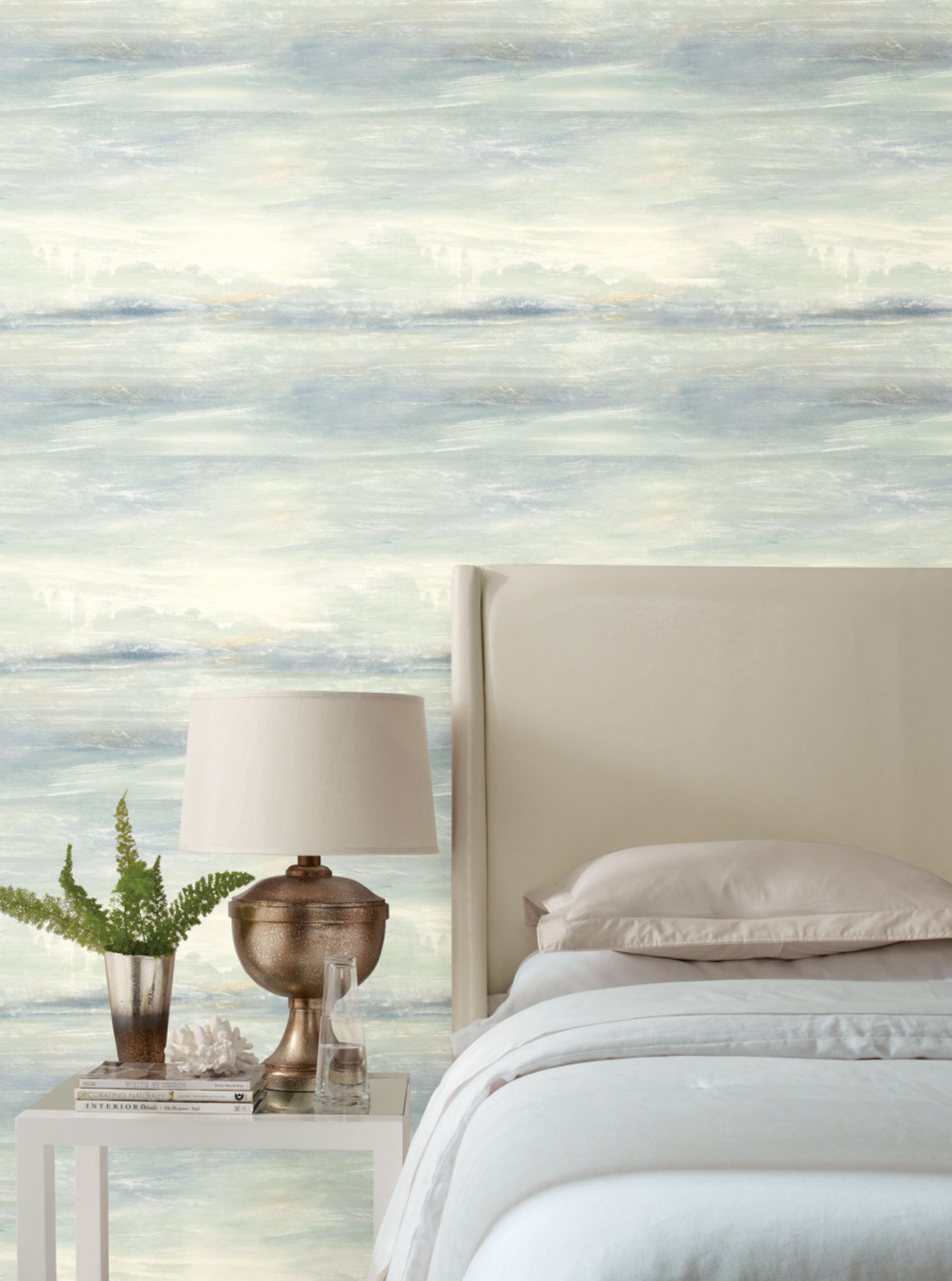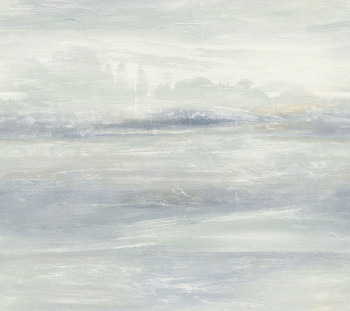 Šedo-modrá vliesová tapeta na zeď, vzor evokuje ruční malbu krajiny v mlze.