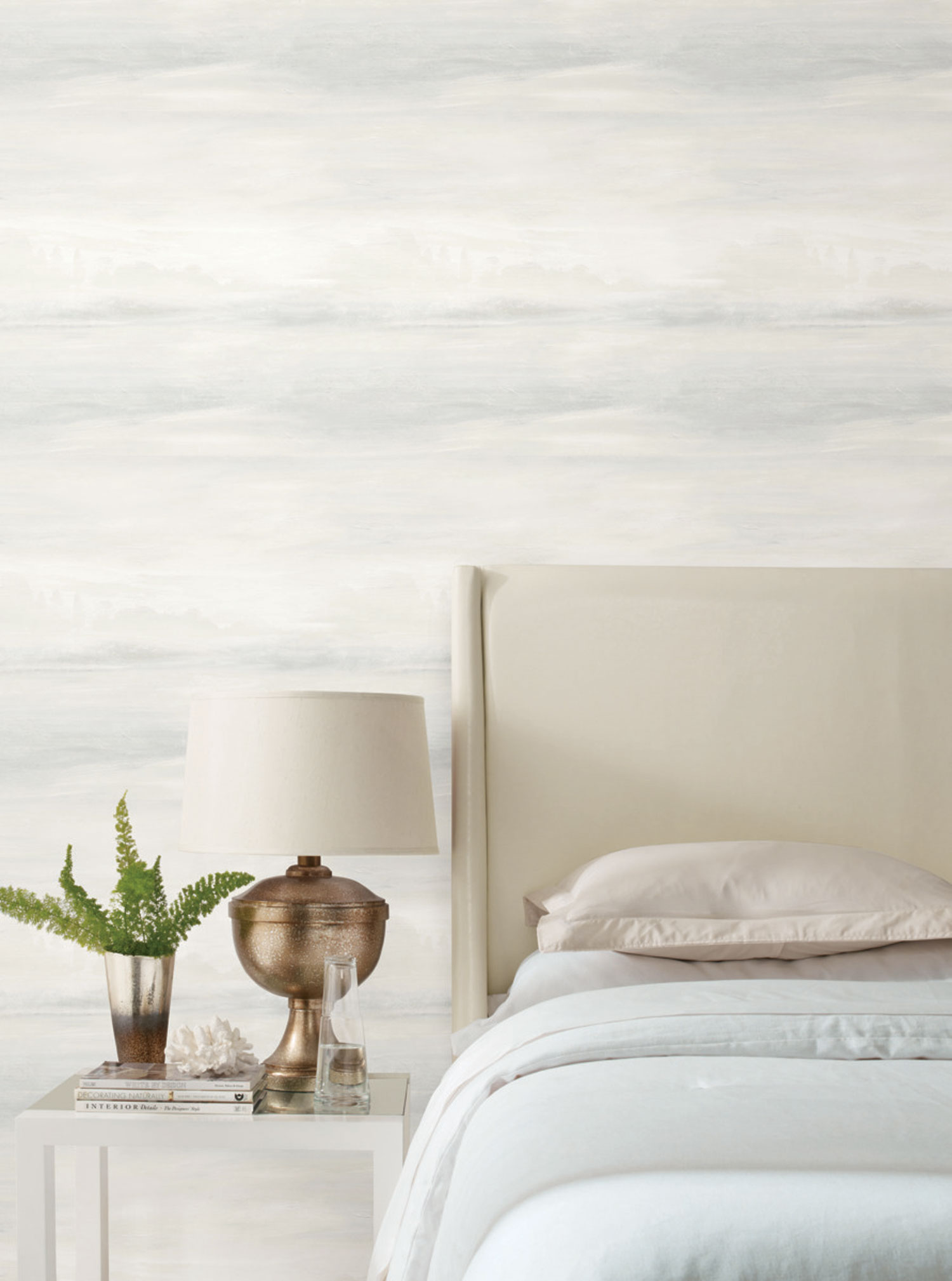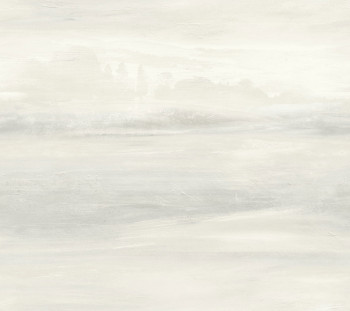 Šedo-krémová vliesová tapeta na zeď, vzor evokuje ruční malbu krajiny v mlze.