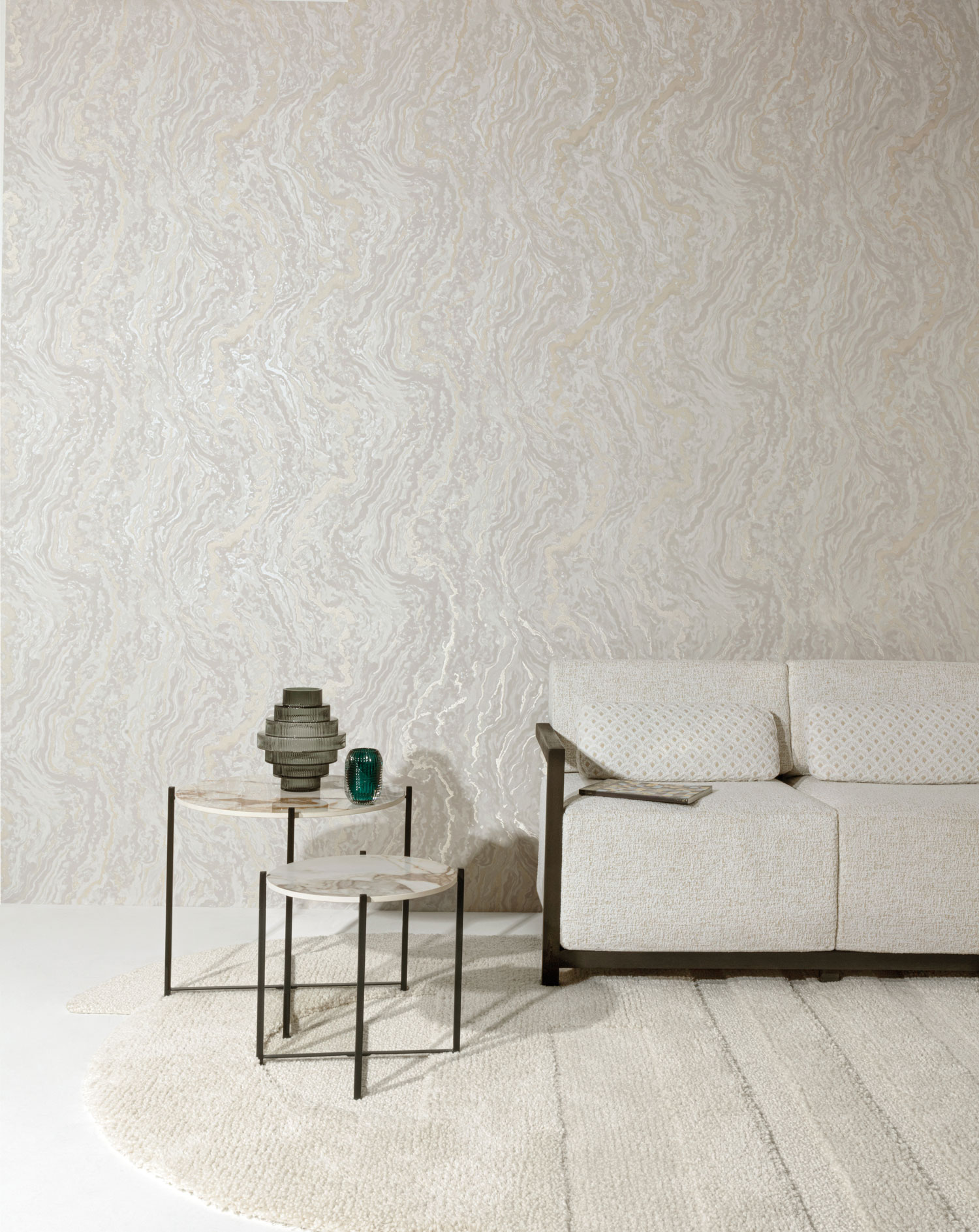 Vliesová mramorovaná tapeta s vinylovým povrchem, odstíny béžové. Foto interiéru je pouze ilustrační - odlišné barvy.