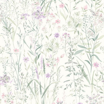 Bílá vliesová tapeta na zeď, luční trávy a květiny v odstínech zelené a růžové, látková textura.