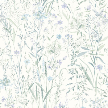 Bílá vliesová tapeta na zeď, luční trávy a květiny v odstínech zelené, modré a lila, látková textura.