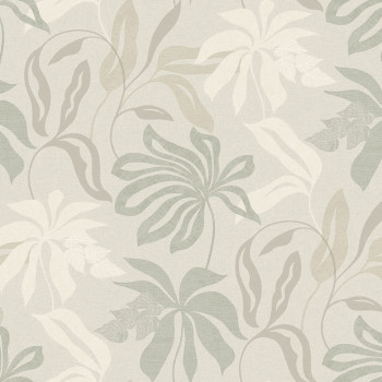Šedo-béžová vliesová tapeta s listy v odstínech šedé, béžové a krémové, látková textura. Foto interiéru je pouze ilustrační - odlišné barvy.