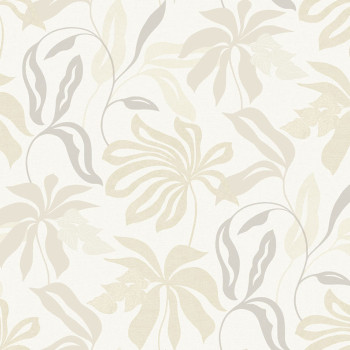 Bílá vliesová tapeta s listy v odstínech šedé a krémové, látková textura. Foto interiéru je pouze ilustrační - odlišné barvy.