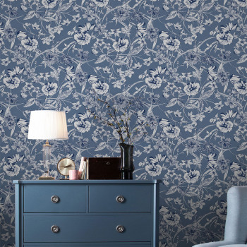 Matná modrá vliesová tapeta na zeď, metalický stříbrný květinový vzor.