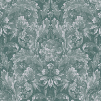 Vliesová tapeta na zeď, bohatý květinový vzor v odstínech nefritově zelené.