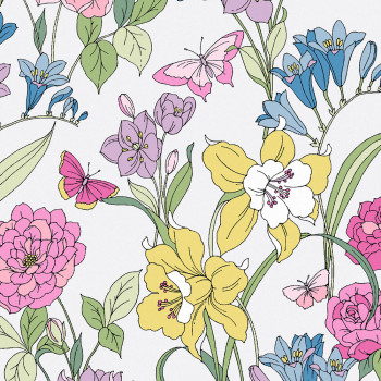 Bílá vliesová tapeta na zeď, květinový vzor, motýlci.