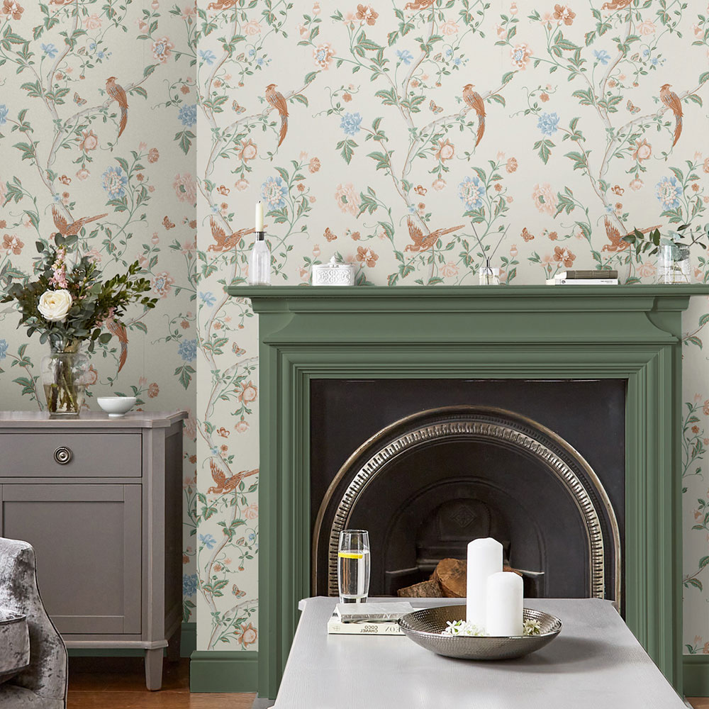 Krémová vliesová tapeta na zeď, motivy květin, motýlků a ptáků.